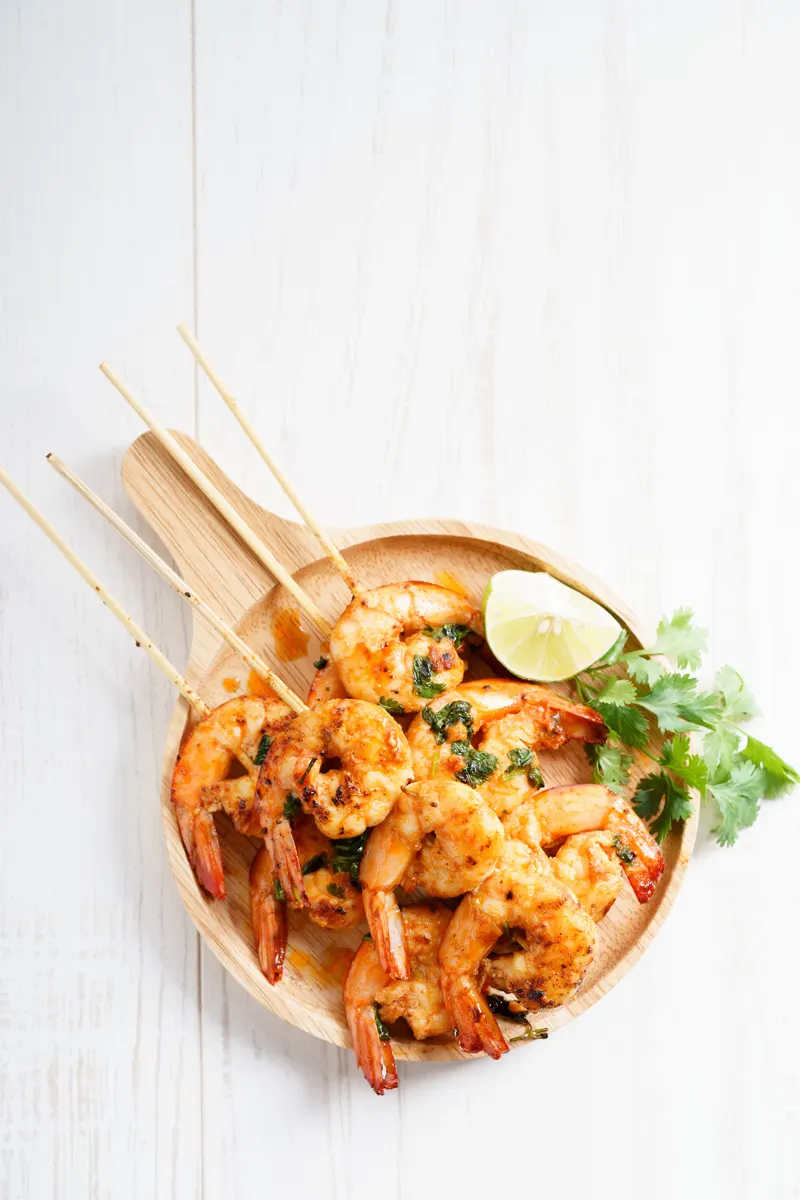 Ces crevettes sont également excellentes à l'heure de l'apéro! Cuisez-les sans les enfiler sur des brochettes et servez-les avec des petits pics de bambou, avec leur garniture.