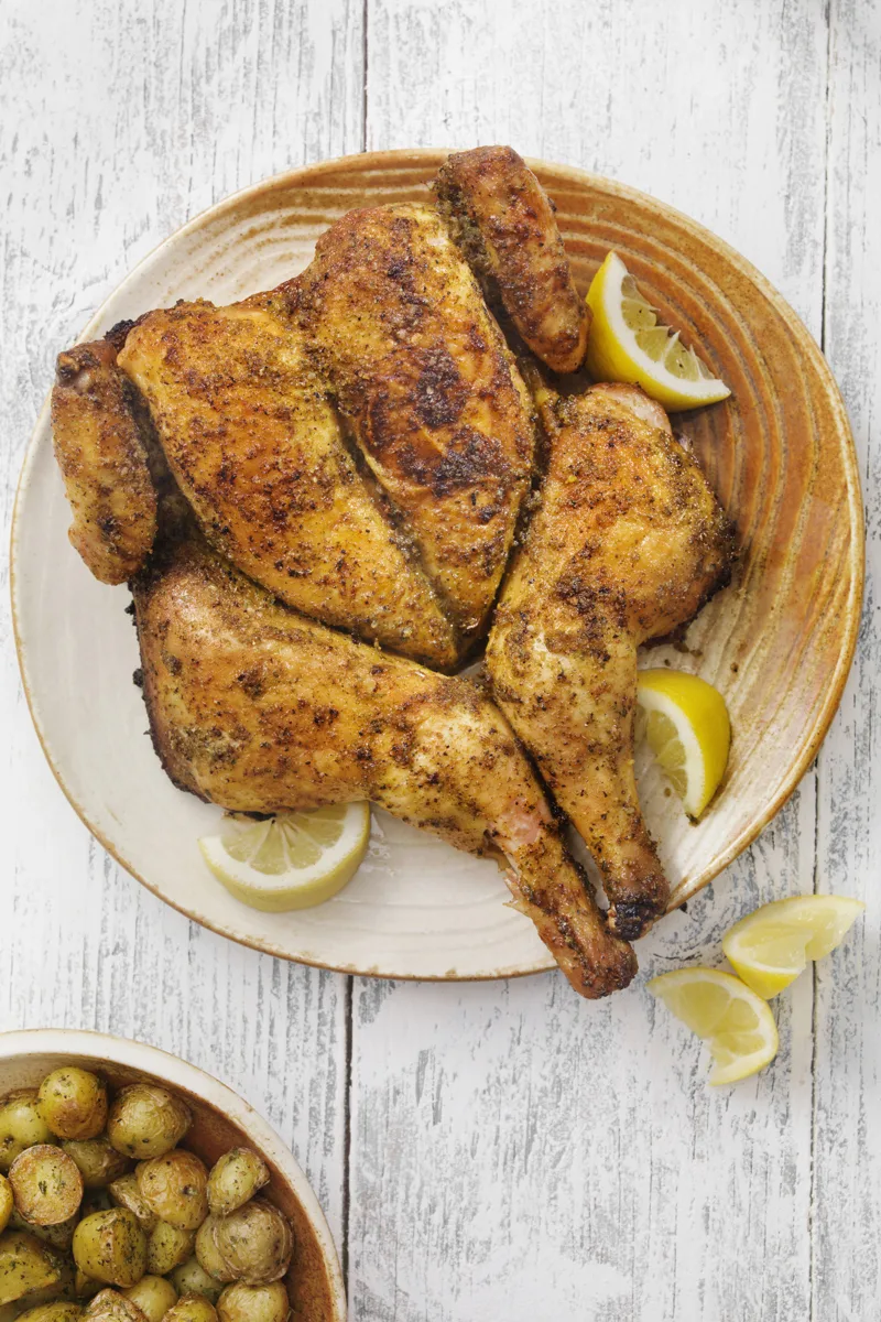 La cuisson en crapaudine permet de cuire le poulet plus rapidement qu'un poulet entier de 2 kg (4 lb), qui nécessite environ 1 ½ heure de cuisson, contre 45 minutes pour le premier. Et comme les pommes de terre cuisent avec le poulet sur la plaque, pas de casserole à laver! La marinade au citron, au sirop d'érable, à la moutarde de Dijon, à la sauce soya, au thym, au romarin et à l'ail parfume à merveille le poulet.