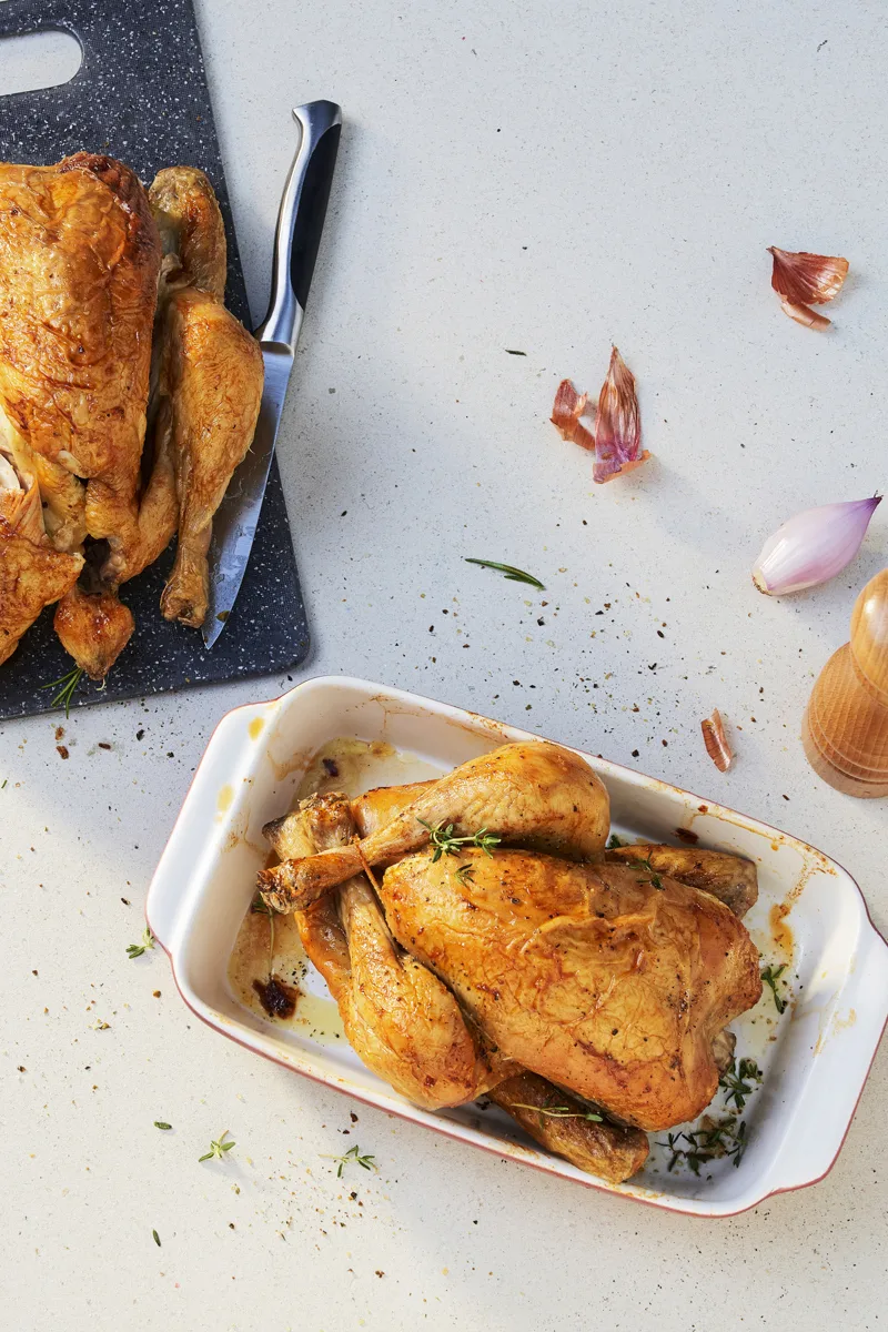 Mmm, la bonne odeur d'un poulet qui cuit... Entouré de légumes, relevé d'herbes et d'épices odorantes, ce savoureux poulet vous comblera. Servez-le avec du riz et un légume vert. Utilisez les restes de volaille dans un riz chinois, un sauté asiatique, un plat de pâtes ou en sandwich. Pratique pour les soupers de semaine pressés!