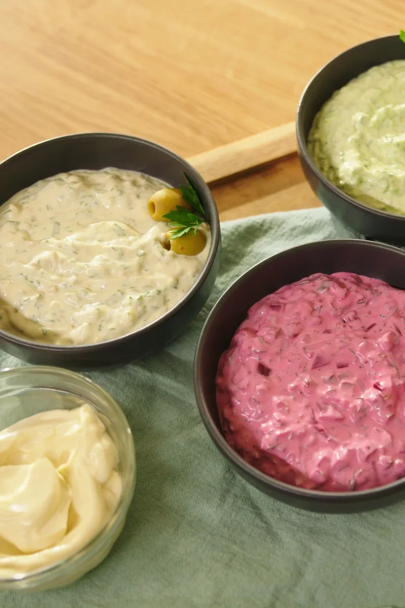 Trois mayonnaises passe-partout pour égayer vos plats. La mayonnaise betterave et cornichons surprendra, celle au persil, citron et olives rehaussera vos plats et celle aux pois verts, menthe et lime ajoutera de la fraîcheur à votre assiette.