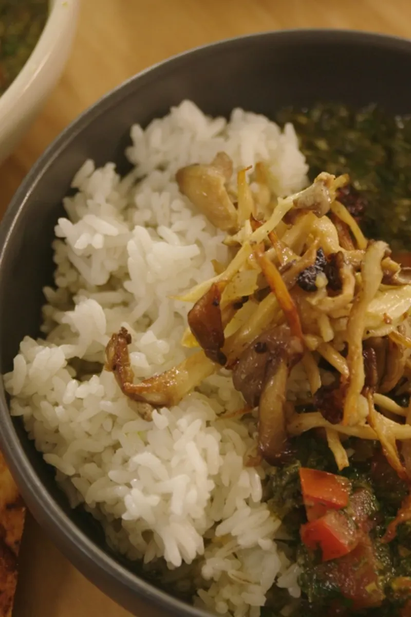 On se laisse transporter et on découvre la molokheya, une recette du Moyen-Orient et de l'Afrique du Nord. Préparé avec de la molokheya (aussi appelée corète potagère), ce plat est parfumé à la coriandre et la cardamome. On le sert sur un riz et accompagné d’une belle poêlée de pleurotes pour un maximum de saveurs.