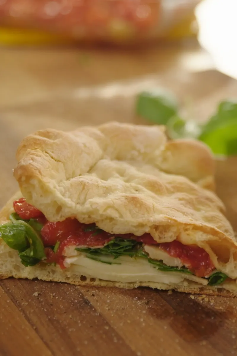 Avec la pelle à pizza, retirer les deux sandwichs-pizza. Saler et poivrer les tranches de fromage mozzarella. Répartir les tranches de fromage à l’intérieur des sandwichs pendant que la pâte est encore très chaude. Garnir des tomates cerises avec leur jus de cuisson et terminer avec la salade de roquette. Refermer chaque sandwich-pizza, couper en deux et servir aussitôt.