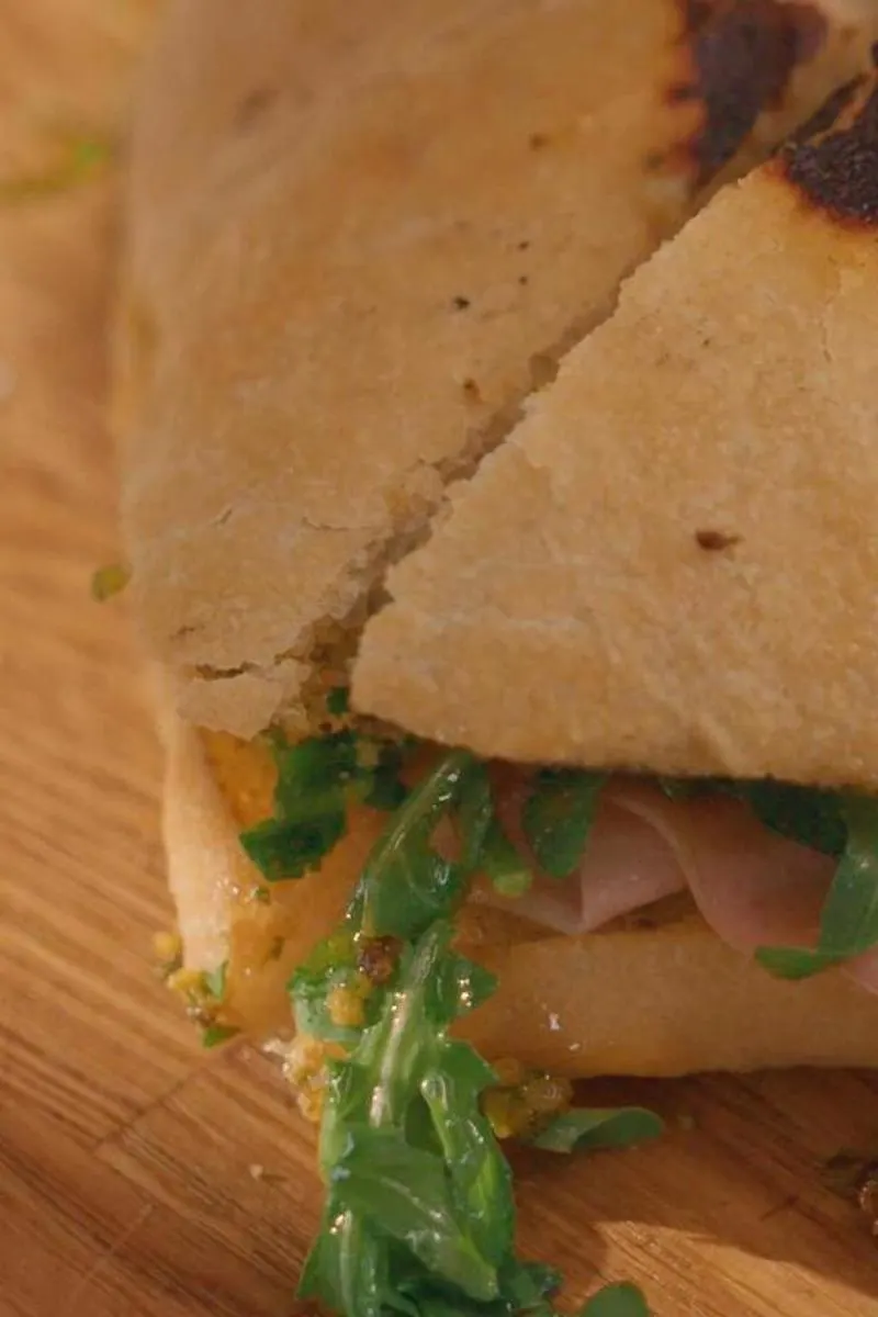 Tartiner l’intérieur des pains avec le pesto à la pistache, garnir avec les viandes froides et la roquette.